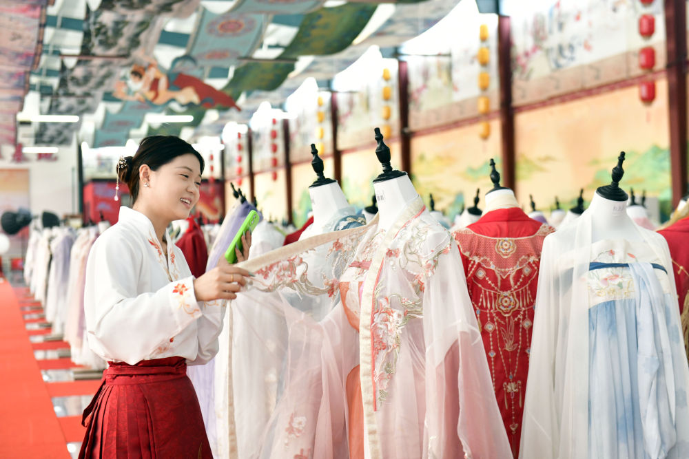 9月27日,在山东曹县大集镇一家汉服基地,主播直播推介汉服。新华社记者 郭绪雷 摄