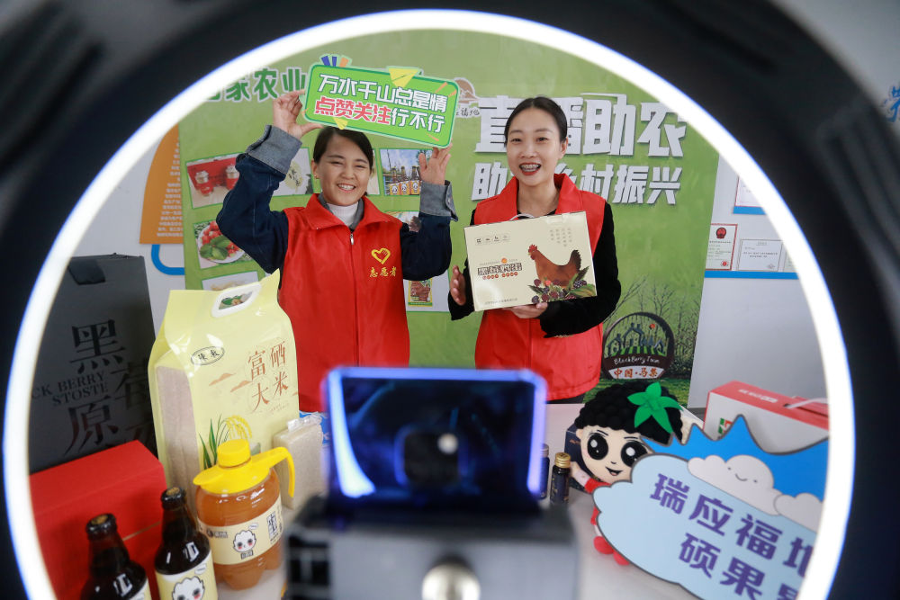 11月10日,志愿者在直播间直播销售江苏省仪征市马集镇的农产品。新华社发(孟德龙摄)