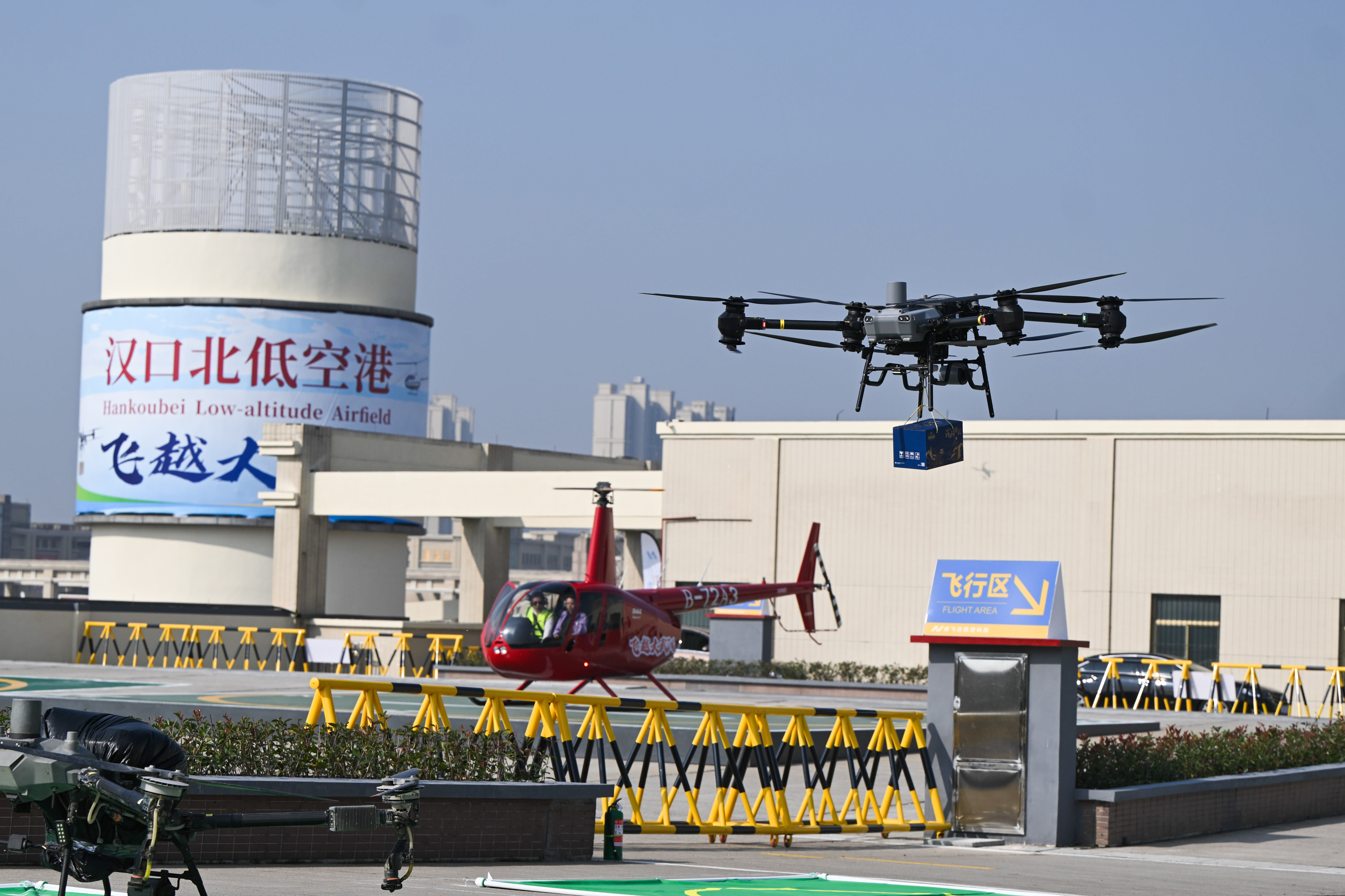 11月12日,装配快递盒的无人机在汉口北低空港无人机停机坪起飞。