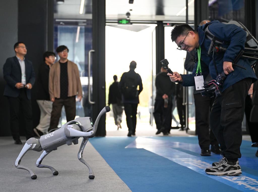 11月19日,在2024年世界互联网大会“互联网之光”博览会上,参观者与一款智能机器狗互动。新华社记者 蔡湘鑫 摄