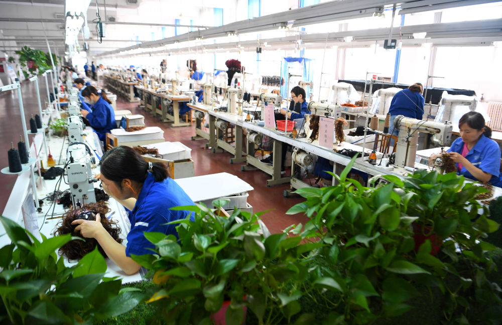 走进这家股份公司的生产车间,工人们或操作机器、或手挽针挑,长短不一、造型各异的假发材料,在灵活翻飞的双手下,眨眼间就变成了一顶顶颜色艳丽的时髦假发产品。不出一周,这些产品就会被摆上海外各地的柜台。