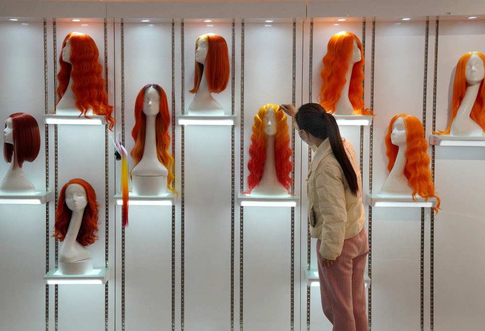 市民在河南瑞贝卡发制品股份有限公司的展厅内挑选假发。新华社记者 李安 摄