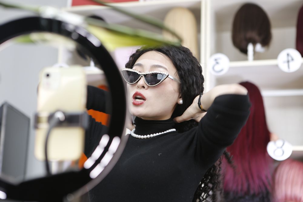 河南瑞贝卡发制品股份有限公司的工作人员在电商平台直播介绍产品。新华社记者 戴翘楚 摄