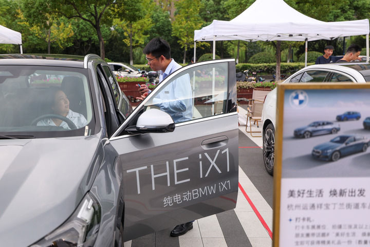 在浙江省杭州市上城区丁兰街道,经销商(右)在“美好生活 焕新出发”消费品以旧换新展会现场向消费者介绍车辆(2024年9月27日摄)。新华社记者 江汉 摄