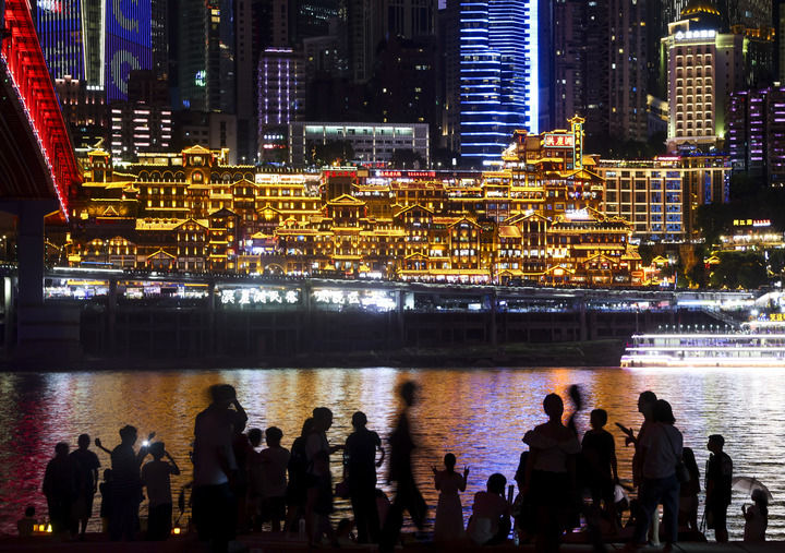 游客在重庆市江北区嘉陵江畔观赏洪崖洞景区的夜景(2024年8月23日摄)。新华社记者 刘潺 摄
