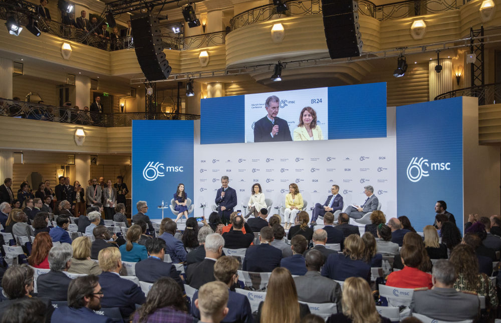 2024年2月18日,慕安会主席克里斯托夫·霍伊斯根(中左二)在德国慕尼黑举行的第60届慕尼黑安全会议上发表闭幕致辞。新华社记者 张帆 摄