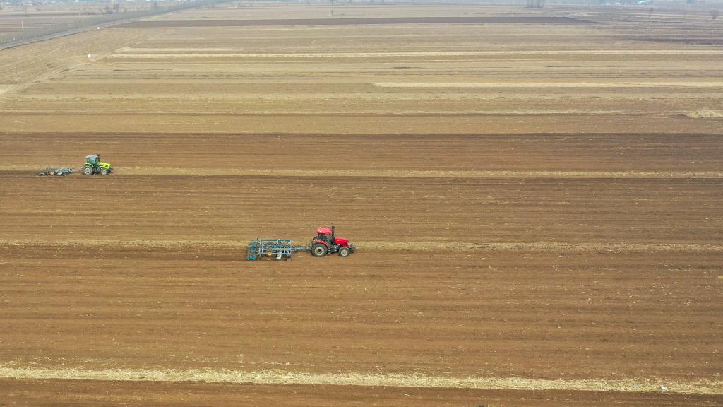 4月9日,在吉林省公主岭市朝阳坡镇东兴村,公主岭市军平种植家庭农场农民驾驶农机整理土地,为春耕做准备(无人机照片)。新华社记者 张楠摄