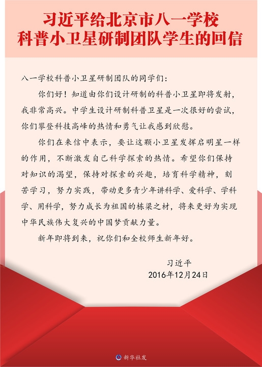 三个多月后,同学们给习近平总书记写信,报告小卫星即将发射的消息,很快收到了总书记的回信。习近平总书记在回信中说,“你们攀登科技高峰的热情和勇气让我感到欣慰”“希望你们保持对知识的渴望,保持对探索的兴趣,培育科学精神,刻苦学习,努力实践,带动更多青少年讲科学、爱科学、学科学、用科学,努力成长为祖国的栋梁之材”。
