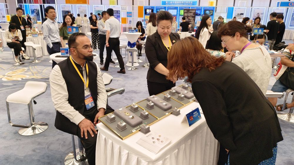 7月8日,第八届进博会消费品展区、服务贸易展区展前供需对接会暨上海招商路演上,外国展商(左一)正在与中国采购商对接。叶宣驿 摄
