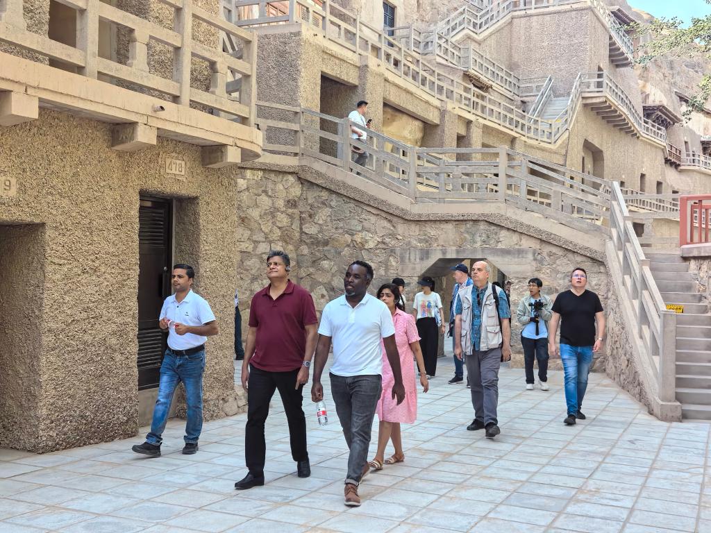 7月8日,参加全球文明对话部长级会议的嘉宾在甘肃参观敦煌莫高窟。新华社记者 任延昕 摄
