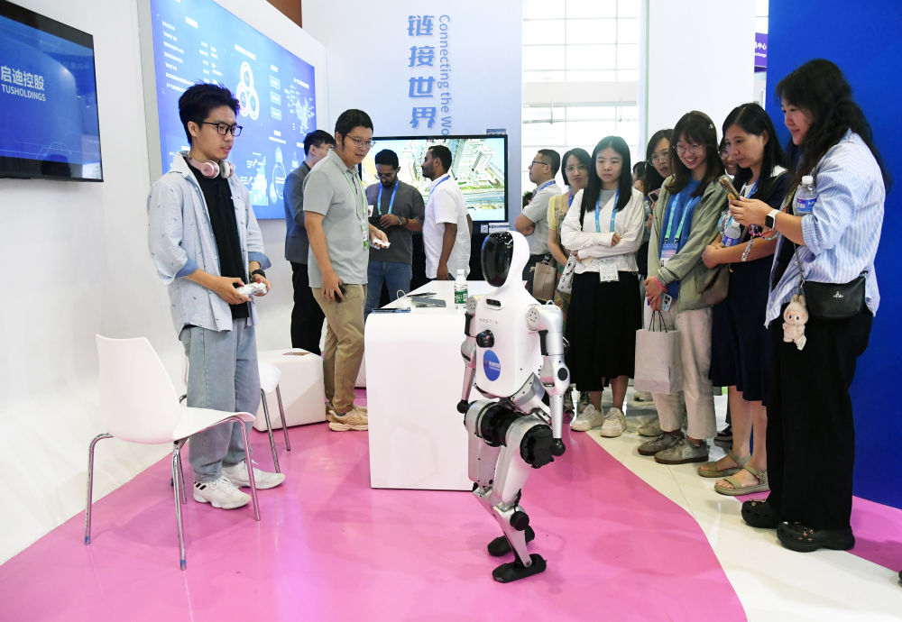 7月17日,观众在第三届中国国际供应链促进博览会创新链专区与人形机器人互动。