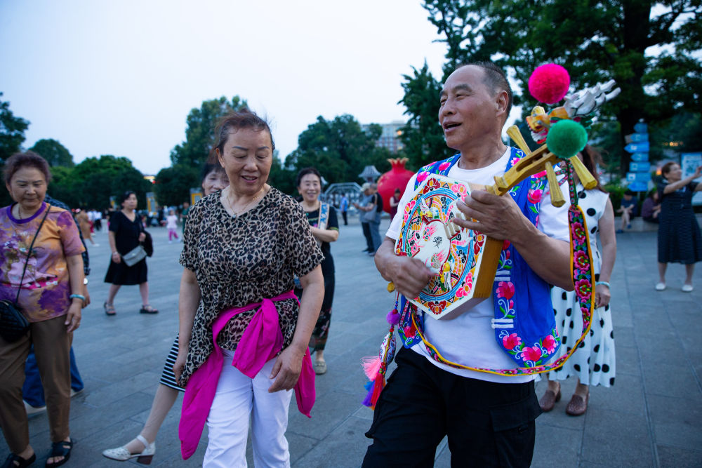 游客在云南省曲靖市南城门广场与当地群众一起“打跳”。(杨俊鹏 摄)