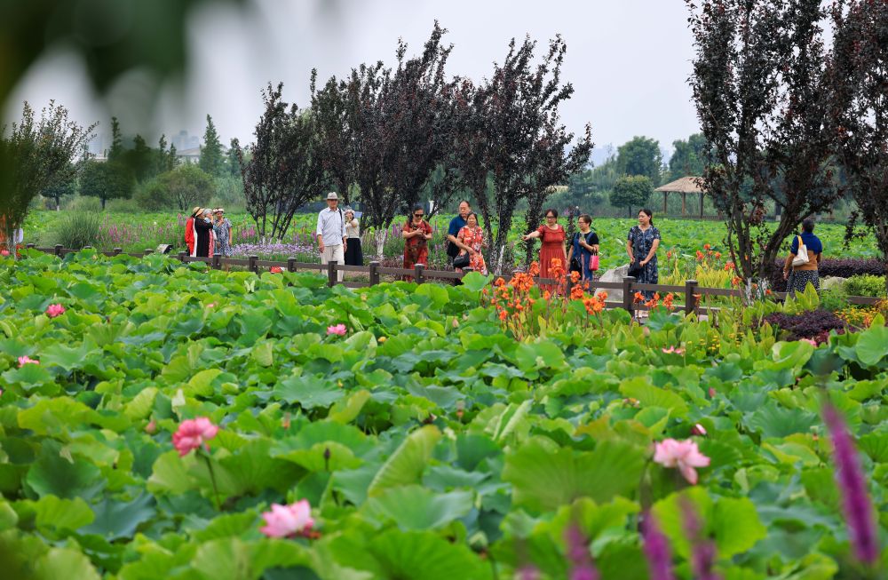 游客在云南省曲靖市麒麟区沿江街道麒麟水乡赏景游玩。(孙文来 摄)