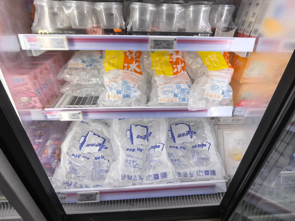 近日,在上海多家连锁超市和便利店,食用冰产品均盛放在冷冻冷藏区的显眼位置,并已发展出多种类型:形态方面,有方块冰、月牙冰、球型冰等,一般单个冰块体积越大,价格越高;风味方面,除传统的纯水冰块外,还有水果、焦糖、咖啡等口味,后者价格也更高;包装方面,主要分为适合居家储存的“袋冰”和便于户外即食的“冰杯”。