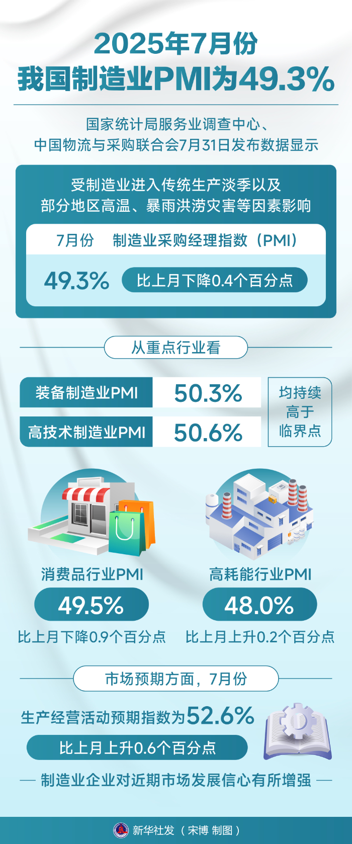 国家统计局服务业调查中心、中国物流与采购联合会7月31日发布数据显示,受制造业进入传统生产淡季以及部分地区高温、暴雨洪涝灾害等因素影响,7月份制造业采购经理指数(PMI)为49.3%,比上月下降0.4个百分点。
