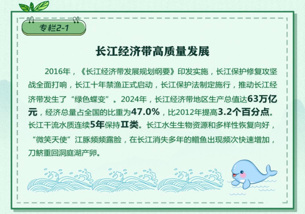 建设绿色发展高地,核心是深入践行绿水青山就是金山银山的理念,坚持生态优先、绿色发展,推动实现发展和保护的协调统一。京津冀协同发展11年,PM2.5降幅均超六成,湿地面积持续减少态势得到扭转。同时,经济总量连跨6个万亿元台阶,2024年达11.5万亿元。长江流域2024年水质优良断面比例达到98.6%,长江经济带万元GDP用水量逐年下降,地区生产总值63万亿元,同比增长5.4%,对全国经济增长的贡献率为50.1%。长三角地区生态质量指数高于全国平均水平,新能源汽车、光伏、锂电池、节能环保等战略性新兴产业集群加快融合发展。粤港澳大湾区积极推进美丽中国先行区建设,区域生态环境质量和绿色发展水平走在全国前列,其中广东2024年PM2.5平均浓度为20.6微克每立方米,连续5年稳定优于世界卫生组织过渡期第二阶段目标值,新能源产业集群营收突破万亿元,高质量发展的绿色底色更加鲜明。