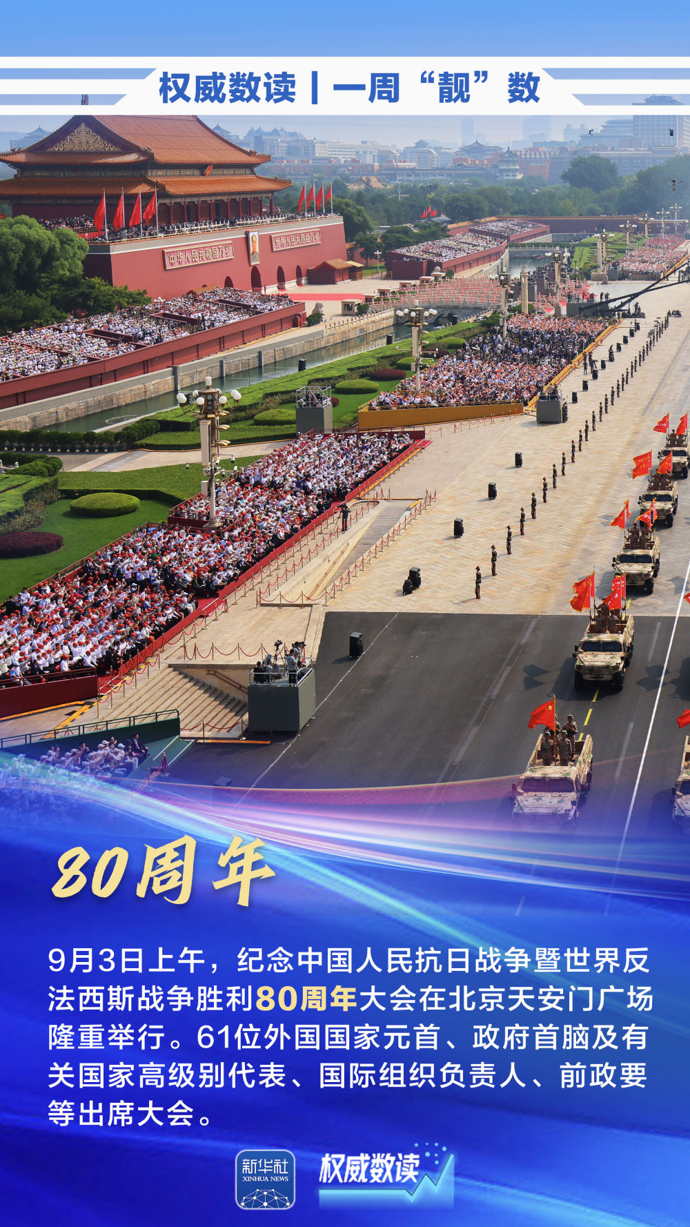 9月3日上午,纪念中国人民抗日战争暨世界反法西斯战争胜利80周年大会在北京天安门广场隆重举行;上合组织天津峰会取得八大成果;7月1日至8月31日,全国铁路累计发送旅客9.43亿人次……本周,这些大事和数据,最值得关注!