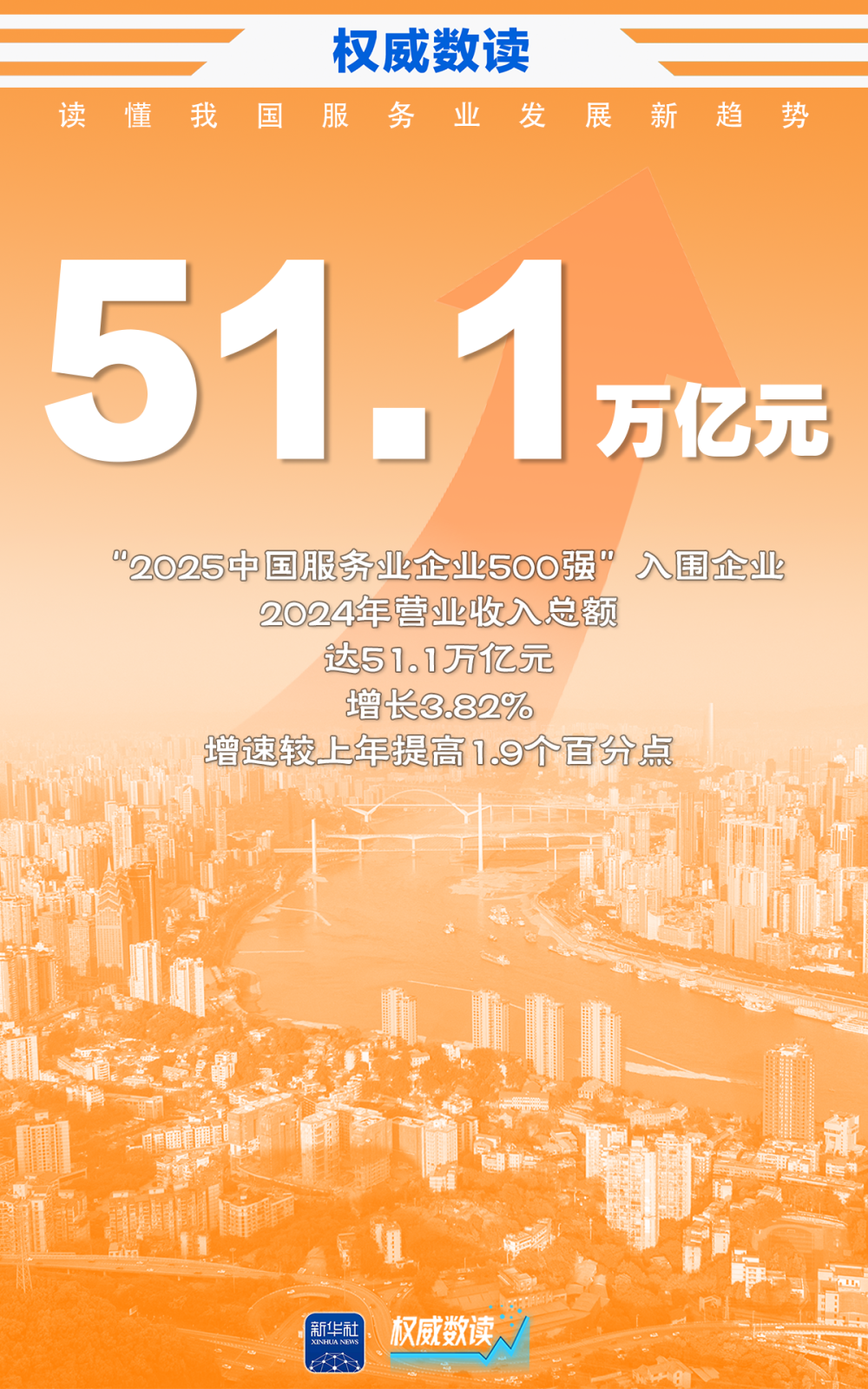 中国企业联合会、中国企业家协会9月18日在重庆发布“2025中国服务业企业500强”。入围企业2024年营业收入总规模迈上新台阶,达到51.1万亿元,平均营业收入规模首次突破千亿元大关,达到1022.2亿元。榜单显示,服务业“500强”企业营业收入增速加快,经营效益结构性向好,新兴服务表现亮眼……一组数据,读懂我国服务业发展新趋势。