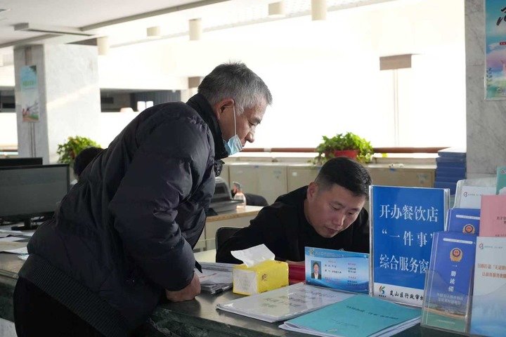 在山东省日照市岚山区行政审批服务局的办事大厅内,市民在“一件事”综合受理窗口办理业务。丁明杰 摄