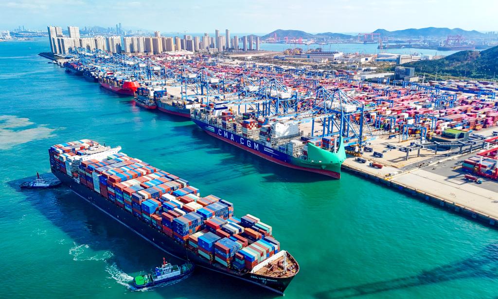 2025年11月5日,一艘货轮满载货物驶出青岛自贸片区(无人机照片)。