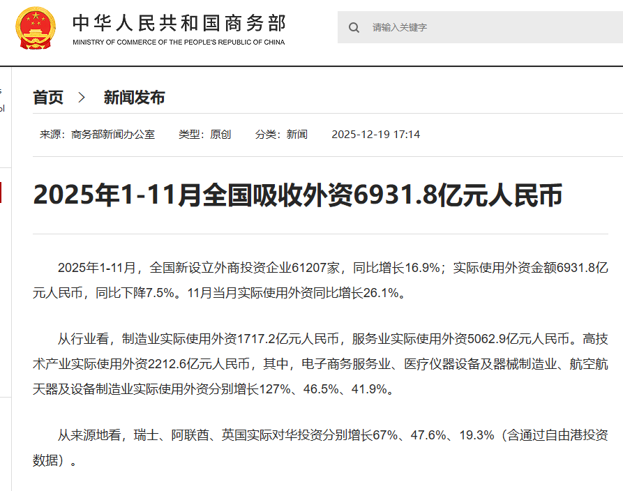 2025年1-11月,全国新设立外商投资企业61207家,同比增长16.9%;实际使用外资金额6931.8亿元人民币,同比下降7.5%。11月当月实际使用外资同比增长26.1%。