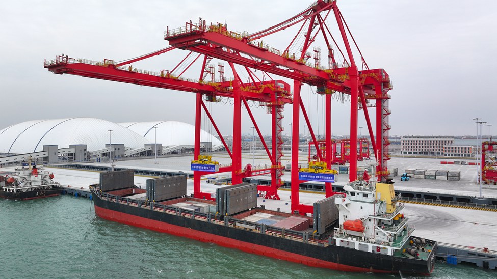 12月22日,装载集装箱的“万木春32”货轮在东营港集装箱码头停靠接卸(无人机照片)。