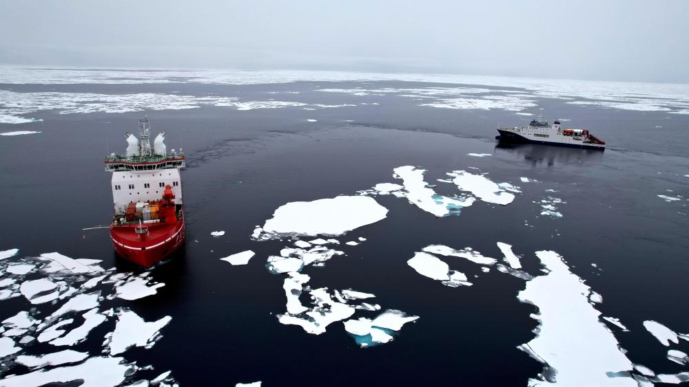 2025年8月11日,“雪龙2”号(左)在北极冰区为“深海一号”破冰引航(无人机照片)。