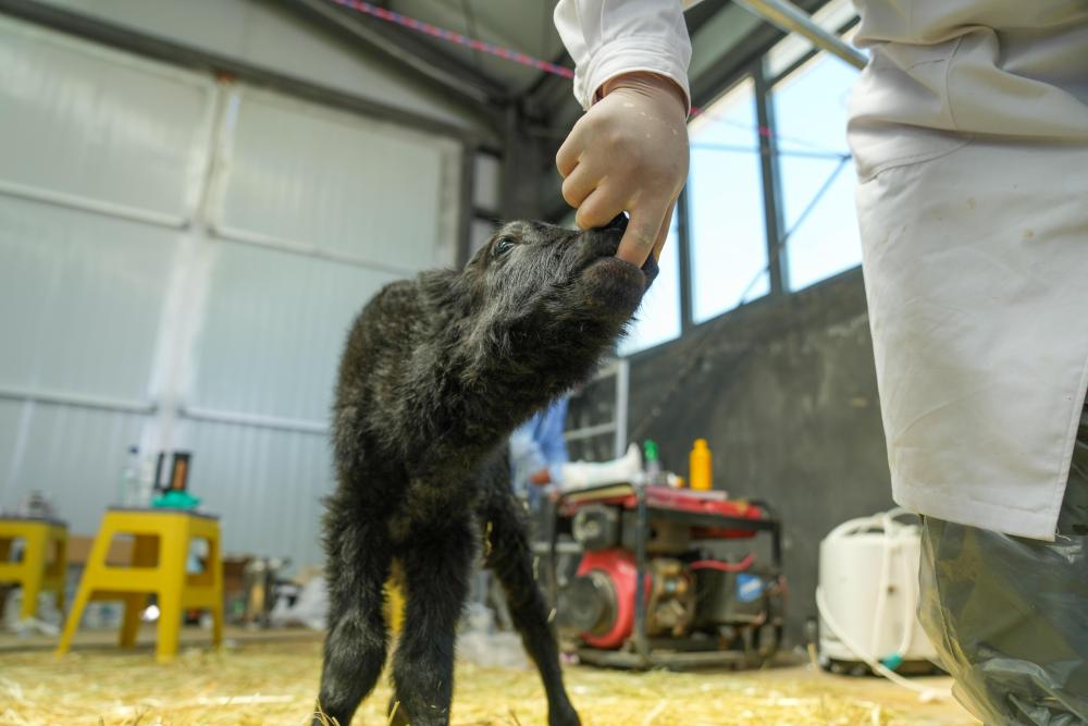 2025年7月11日,在西藏(当雄)金丝野牦牛繁育基地,工作人员检查克隆牦牛身体状况。7月10日中午12时40分,该基地剖腹诞生了第一头克隆牦牛,体重33.5公斤。这头新出生的克隆牛犊个头比正常新生牛犊较大,全身通黑,能够正常行走,身体状况良好。