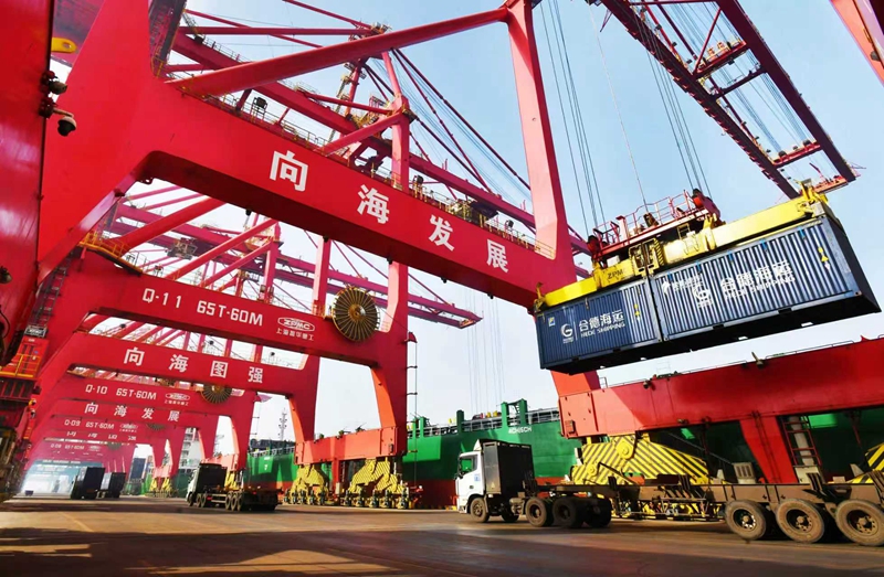 1月15日,在黄骅港综合港区集装箱码头,岸桥设备在进行卸船作业。
