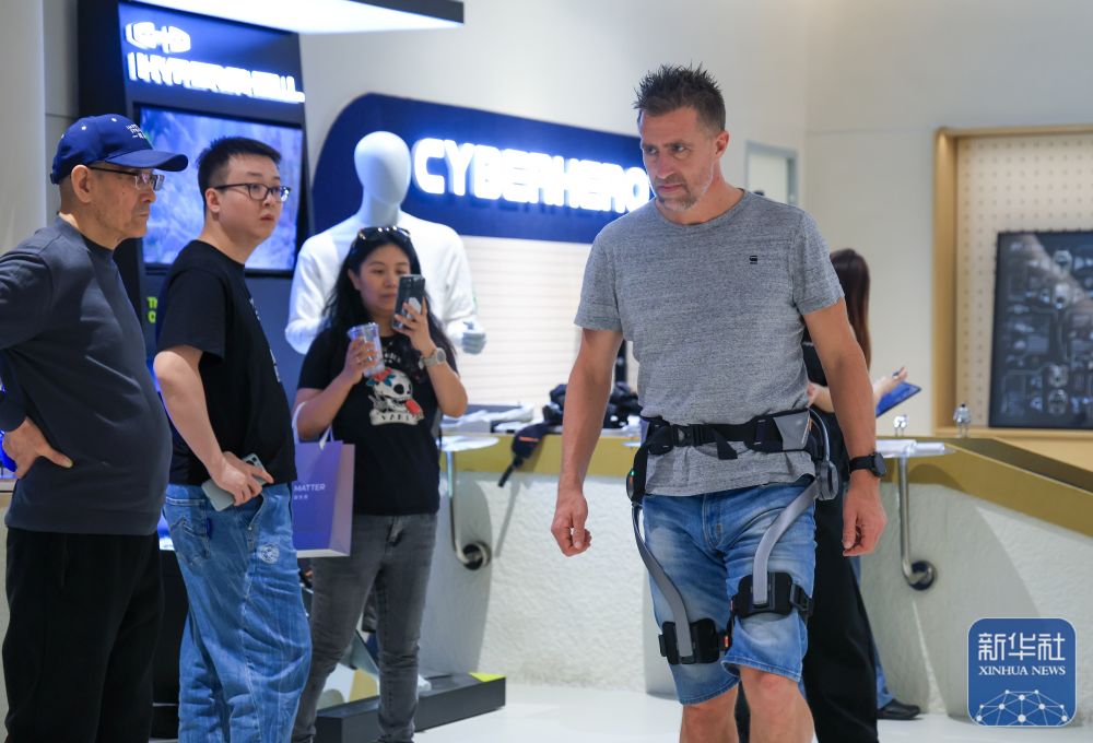 ↑ 1月18日,顾客在深圳市南山区的INNO100全球创新旗舰店体验外骨骼穿戴设备。