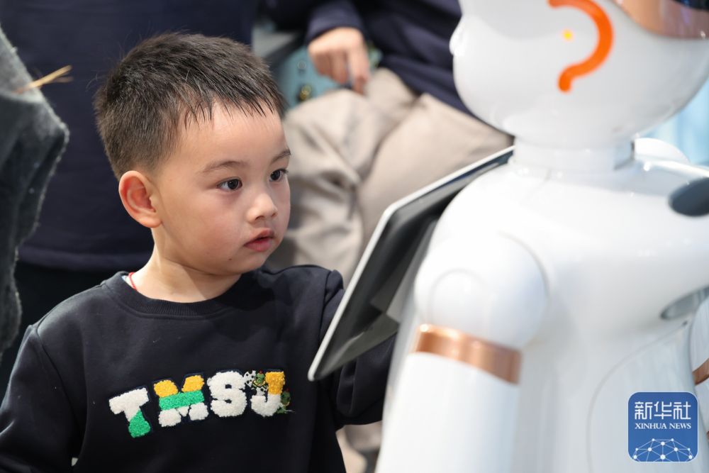 ↑ 1月16日,在深圳市龙岗区的全球首家机器人6S店,小朋友与机器人互动。