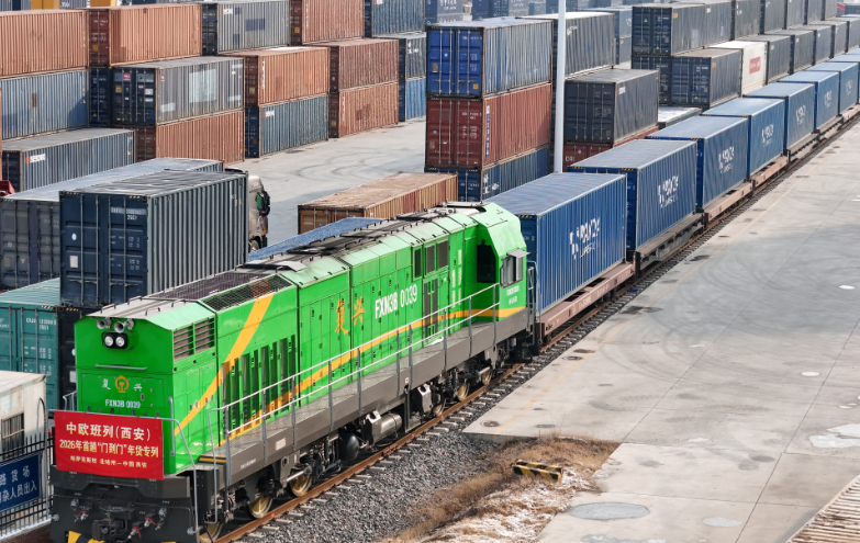 1月21日,2026年首趟中欧班列(西安)“门到门”年货专列满载着哈萨克斯坦成品粮油、蜂蜜等农产品驶抵西安。已连续开行三年的中欧班列(西安)“门到门”年货专列,实现从国外仓库发运到国内仓库收货的“门到门”运输,既有效提升货物运输效率、降低企业运输成本,又丰富春节市场供应。