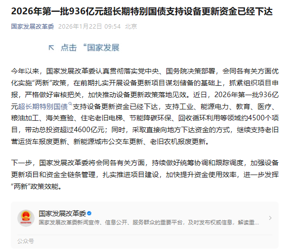 2026年第一批936亿元超长期特别国债支持设备更新资金已经下达