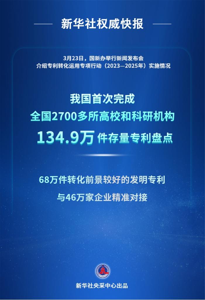 3月23日,国新办举行新闻发布会介绍专利转化运用专项行动(2023—2025年)实施情况。