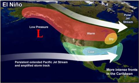 美国气候预测中心预计北半球的厄尔尼诺现象将延续整个冬季,持续到明年春末或夏初。