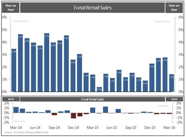 鉴于衰退是由存在较大缺陷的国内生产总值概念衡量判断的,而在国内生产总值中最终消费支出占了资金流总量的约三分之二,因此自然而然我们要开始分析零售支出。根据美国人口普查局的最新数据,继今年1月和2月零售总额小幅减少后,3月零售总额又减少了0.2%。换言之,零售额在第一季度下滑,而汽车销售额在信贷标准降低的支持下于2015年第四季度达到了顶峰水平。