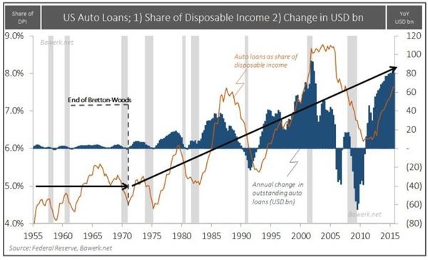 下图从两个数据反映了1955年至2015年美国汽车贷款变化情况,其一是汽车贷款占可支配收入的比率,其二是汽车贷款的每年发放额度。