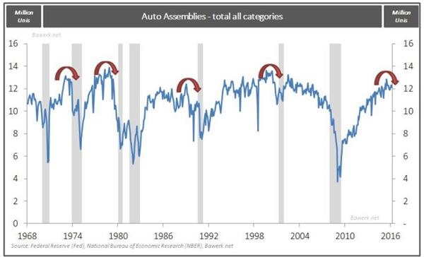 随着在利率极低这一前提下消费者的新旧贷款总额仍达到了某个临界点,汽车库存量的增长速度远快于销售量的,与此同时汽车生产量现在似乎也达到了顶峰水平,以每年增加1200万辆汽车的速度,我们可以肯定未来没有多大的增长潜力。
