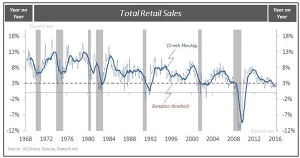 看更长一段时间的零售额数据变化情况,我们会发现每一次年增长率低于3%时美国经济就会陷入衰退。