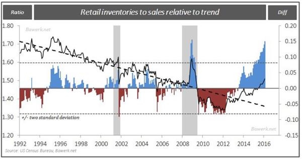 下图显示了1992年至2016年零售库存量与销售量比率呈现下滑趋势。