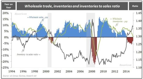 由于库存量仍同比增加而销售量已经在过去十四个月里减少了,批发销售量的情况更糟糕。库存量和销售量比率经过趋势调整后显示出美国批发行业已经陷入衰退。