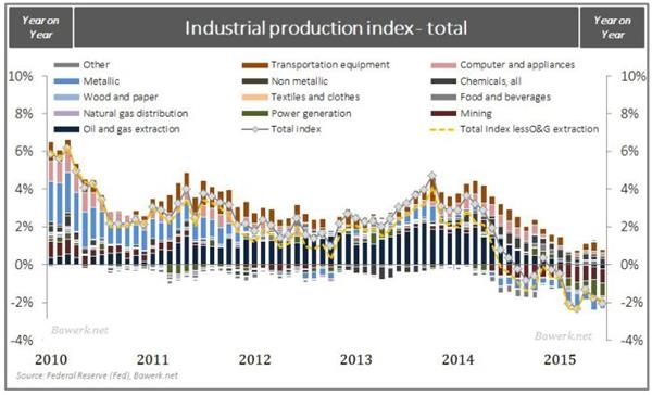在工业产值方面,我们找到了经济疲软的进一步证据。工业产值已经有八个月的时间同比下滑,其原因不仅是油价下滑,还有其他更广泛的因素。