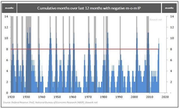 下图反映了1920年至2016年每年环比收缩的月份数量。