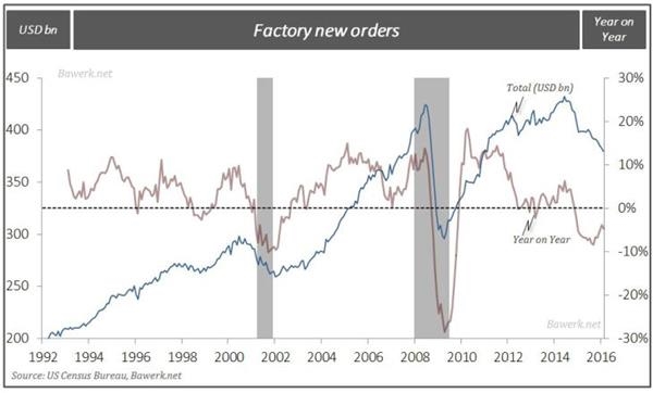 下图反映了1992年至2016年工厂新订单总额以及同比变化情况