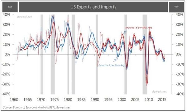 下图反映了1960年至2015年美国出口额和进口额同比波动情况。
