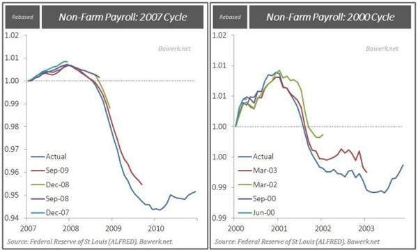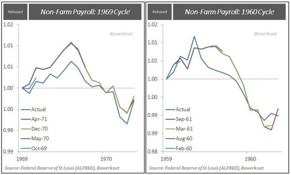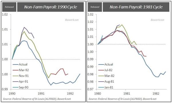 首先,我们要指出机构调查是基于模型的,从本质上看滞后。通过观察每月劳工统计局发布的数据,你将永远无法实时发现趋势突破。我们看了此前几次经济衰退前夕的未经修正的就业数据,然后发现在衰退事实发生后原始数据往往被向下修正。随着衰退势头增大,趋势就会变为负数,在经济走出衰退后的修正又倾向于向上修正,正如我们对滞后指示器的预期一样。