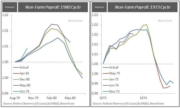 以下八张图反映了1960年、1969年、1973年、1980年、1981年、1990年、2000年、2007年经济衰退前后非农就业数据的变化情况。