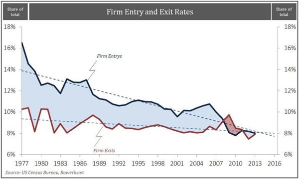 下图反映了1977年至2016年企业成立率和倒闭率变化情况