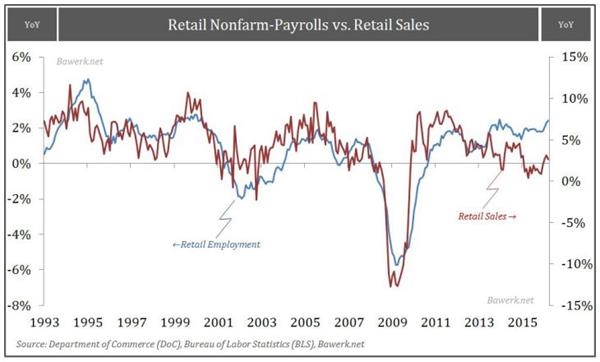 下图反映了1993年至2015年零售行业非农就业人数同比变化率和零售额同比变化率对比情况。