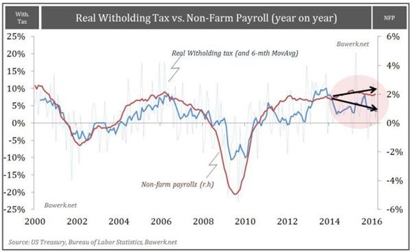 我们还发现收入所得税、就业情况以及年就业增长情况三者脱钩。实际扣缴税收的增长率下滑表明了:美国人要么做兼职工作,要么做收入减少的工作,或者目前的就业增长率并未反映劳动力市场的真实状况。事实可能介于两者之间。